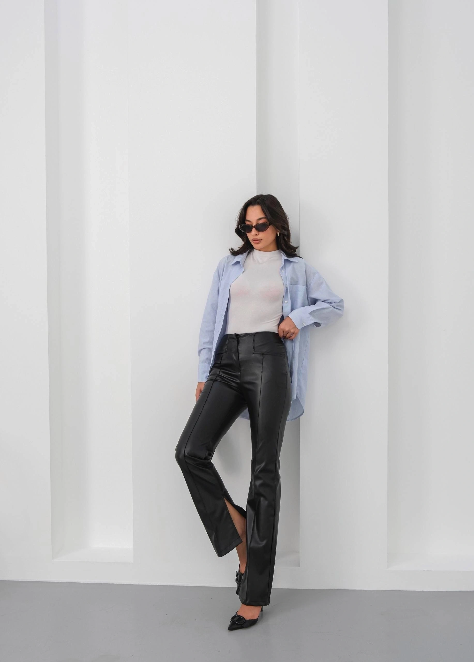 İspanyol yırtmaçlı paça deri pantolon siyah hn, hem günlük hayatta hem de özel günlerde şıklığınızı tamamlamak için ideal bir seçimdir. Sizin de gardırobunuzda mutlaka bulunması gereken bir parça!