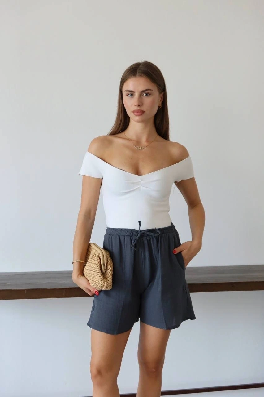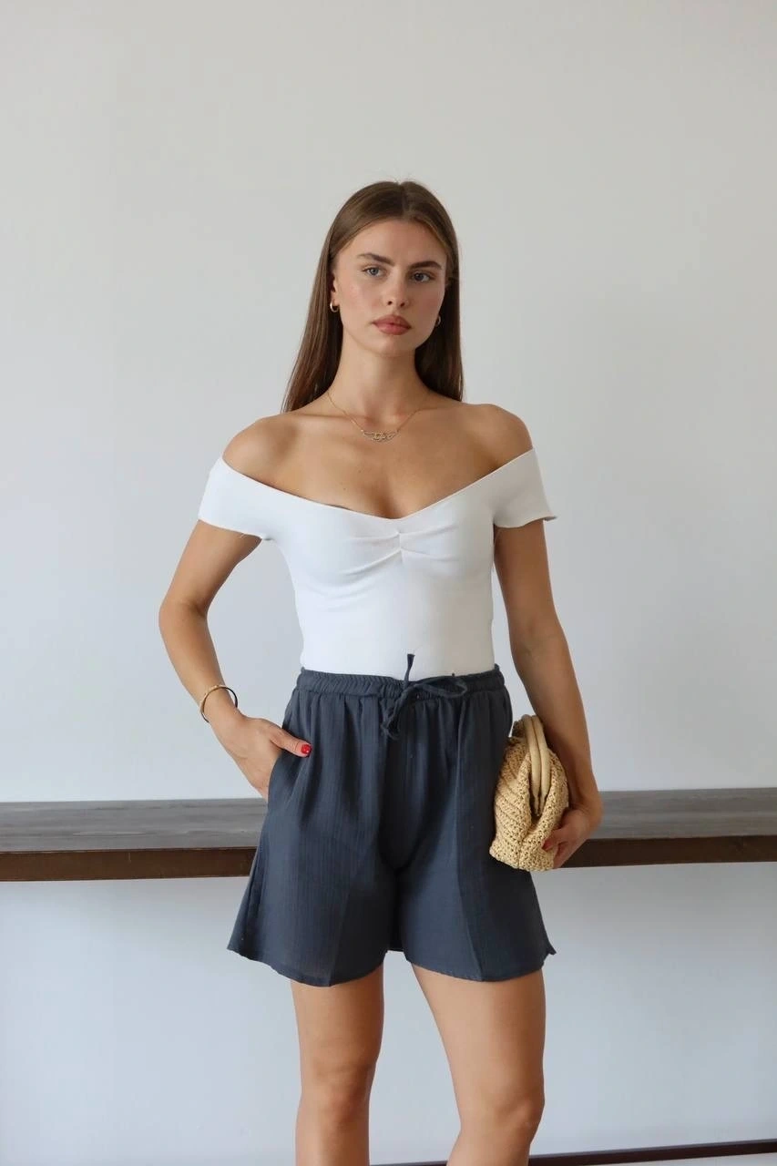 Yaz aylarının vazgeçilmezi şortların şıklıkla buluştuğu Müsli kumaş şort bağcıklı antrasit pt, gardırobunuzun favori parçası olmaya aday!
