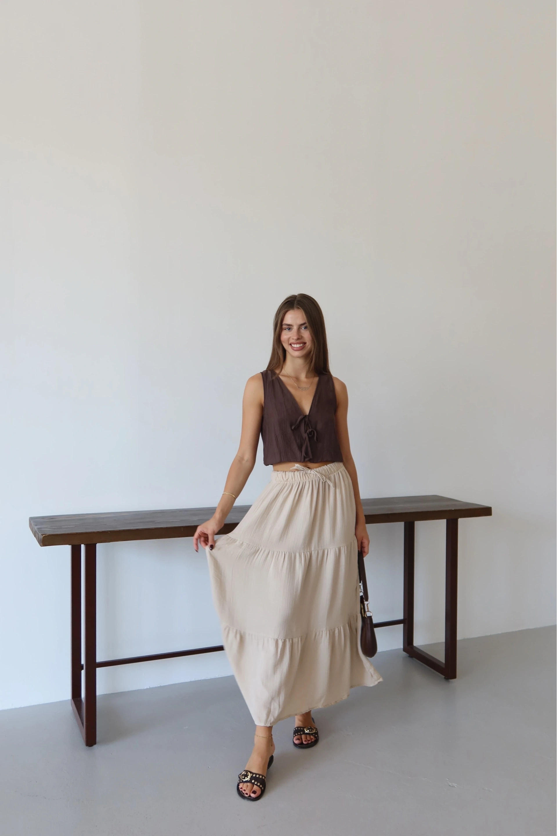 Yumuşak dokulu müslin kumaş ile tasarlanmış olan bu şık uzun etek, gardırobunuzun favori parçalarından biri olmaya aday. Hem şıklığı hem de rahatlığı bir arada sunan bej rengi, her tarza kolaylıkla uyum sağlar. Keten kumaşın sağladığı hafiflik ve doğal görünüm, yaz aylarında tercih edebileceğiniz ideal bir parça haline getiriyor.