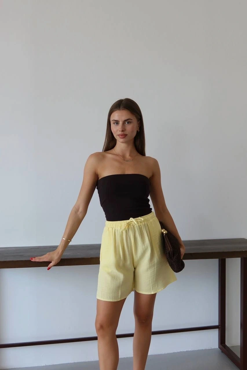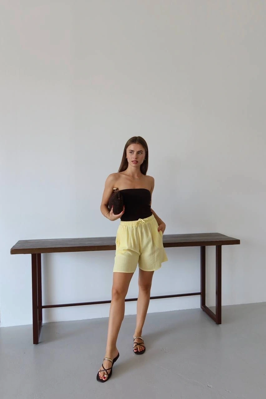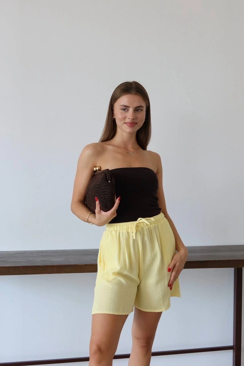 Müslin Kumaş Şort Bağcıklı Sarı PT hem şıklığı hem de rahatlığı bir arada sunuyor. Müslin kumaştan üretilmiş olan bu şort, yaz aylarında serin ve konforlu bir deneyim sunar.