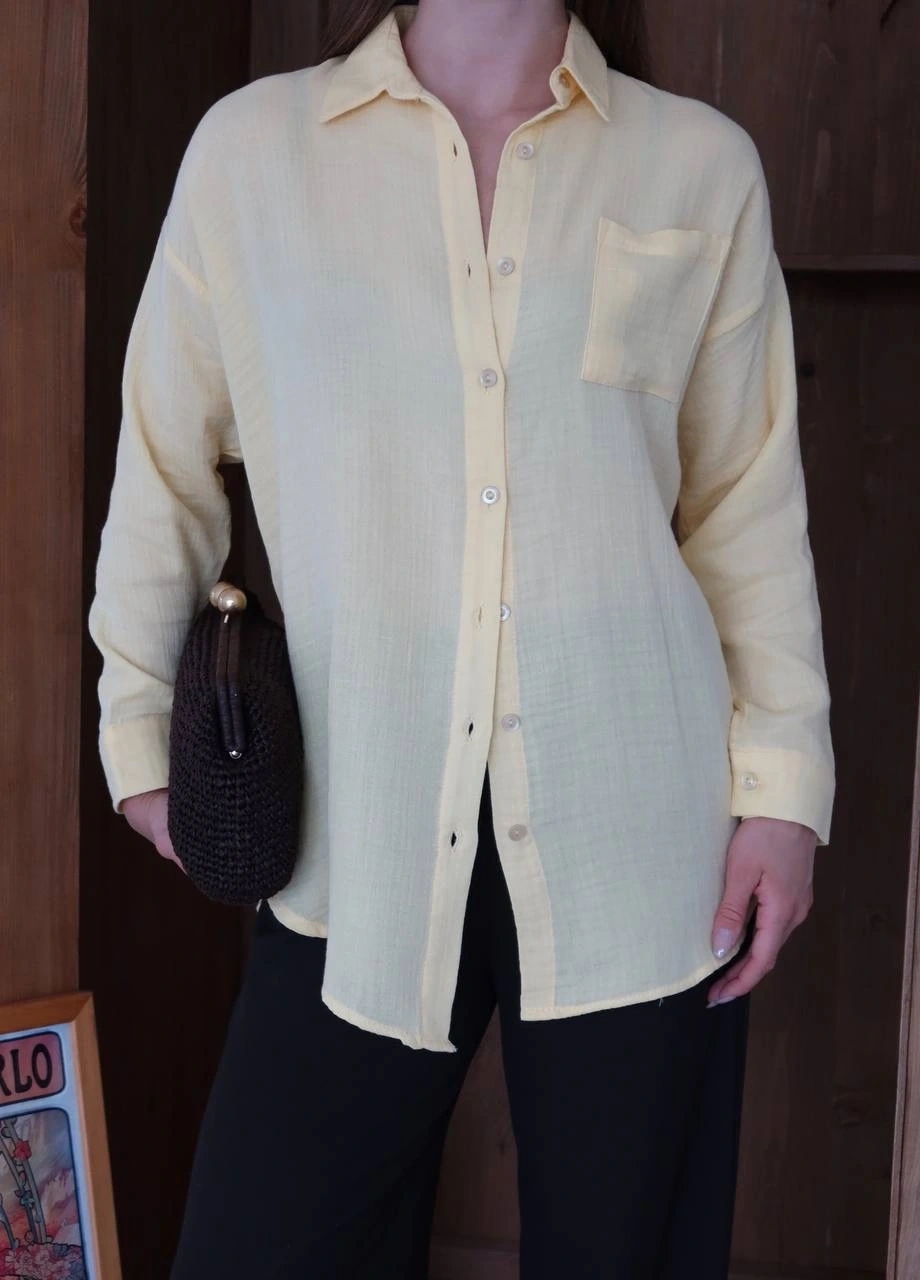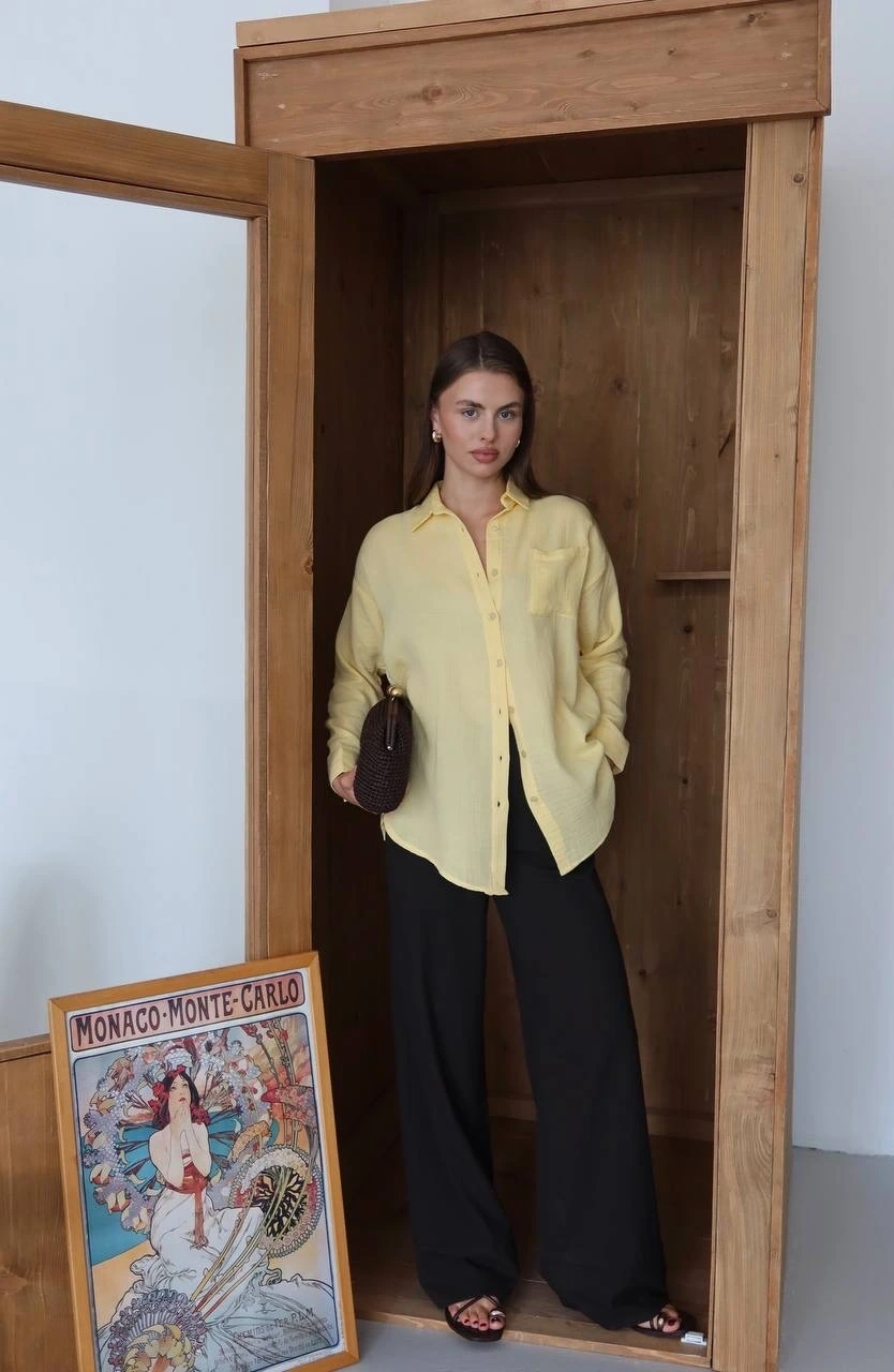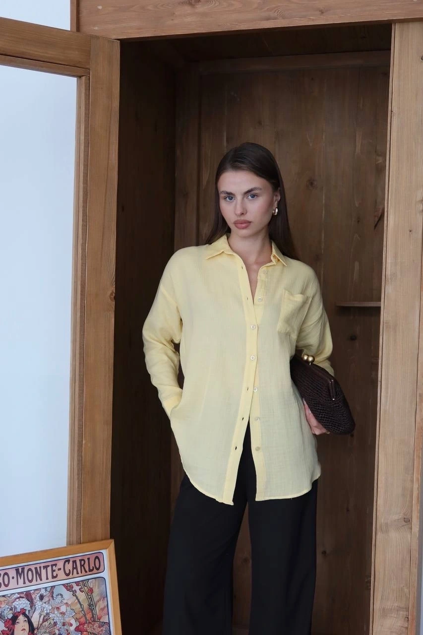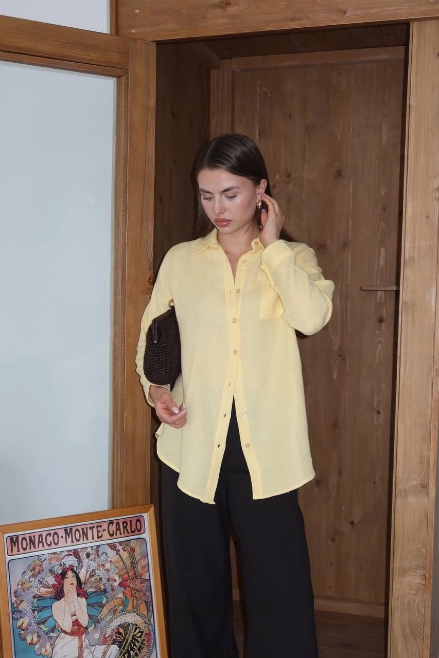 - Sarı rengiyle dikkat çeken gömlek, yaz aylarında ferah ve şık bir görünüm sunar.